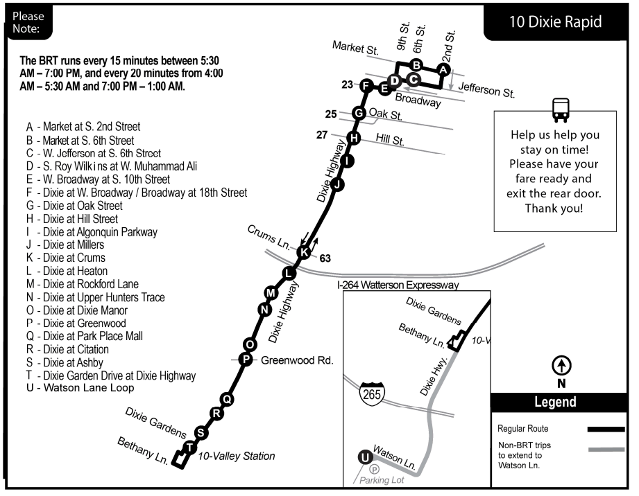 Ruta 10: Dixie Rapid se extenderá al sur de Dixie Gardens para recoger viajes por la mañana y por la tarde a Watson Lane, debido a la realineación de la Ruta 18 al área de Manslick Road. Se implementarán ajustes menores a los tiempos de servicio en la Ruta 10.