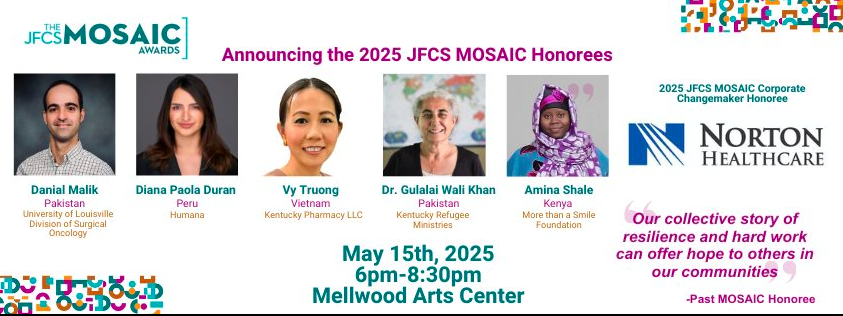 Los Premios JFCS MOSAIC reconocen a refugiados e inmigrantes del área metropolitana de Louisville que han impactado su comunidad. Desde 2006, la organización sin fines de lucro ha honrado a 95 refugiados, inmigrantes y estadounidenses de primera generación de 47 países, quienes ahora consideran a Louisville su hogar y han marcado la diferencia en la comunidad. Los Premios JFCS MOSAIC celebran la diversidad y los logros de estas personas, quienes contribuyen a convertir la ciudad de Louisville y la Mancomunidad de Kentucky en un lugar más brillante e inclusivo. En 2024, se creó un nuevo premio, el Premio al Creador de Cambio Corporativo, para reconocer a una empresa o negocio local que haya tenido un impacto tangible en el apoyo a inmigrantes y refugiados y esté generando un cambio positivo en nuestra comunidad.
