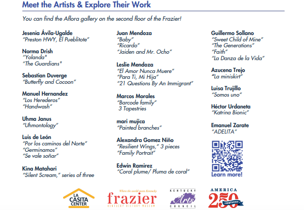 Para conmemorar la inauguración, el Museo de Historia Frazier organiza un Día de Celebración Familiar especial el sábado 13 de septiembre, en colaboración con La Casita Center. Este evento es GRATUITO, el cual promete ser un día lleno de presentaciones en vivo, comida y oportunidades para interactuar con los artistas participantes. Curada por Ada Asenjo y posible gracias a la Sociedad Histórica de Kentucky y el Consejo de las Artes de Kentucky, Aflora reúne una colección de expresiones artísticas, desde pinturas hasta obras multimedia, que encarnan la frase: «Intentaron enterrarnos; no sabían que éramos semillas». Juntas, estas poderosas obras reflejan resistencia, arraigada tanto en la resiliencia como en la esperanza.